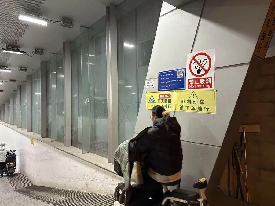 傍晚6时许,正值晚高峰前夕,地道内人来车往,好不热闹。记者驻足观察了短短20分钟,发现超过九成的非机动车驾驶者选择了“骑行”而非“推行”。一位刚买完菜归来的阿姨,跨坐在一辆载满蔬菜的自行车上,双腿夹紧车刹,身体向后仰,试图以此控制车速。然而,由于坡度太陡,车辆依然不受控制地加速下滑,最终“哐当”一声磕在台阶上,阿姨险些从车上摔下。